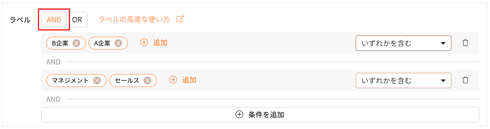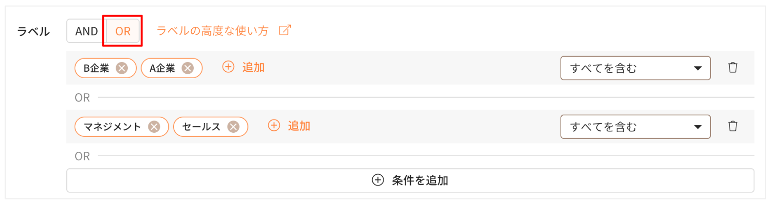 また、「条件を追加」をクリックすることで、複数のラベルを組み合わせた条件を最大5つ同時にAND・OR検索ができます。