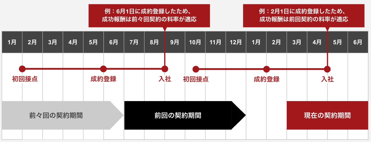 成功報酬の料率には、成約登録日において締結されている契約において定められた料率(およびミニマムギャランティ)が適用されます。契約期間外に登録された成約の場合は、成約登録日の直前に締結されていた契約において定められた料率(およびミニマムギャランティ)が適応されます。