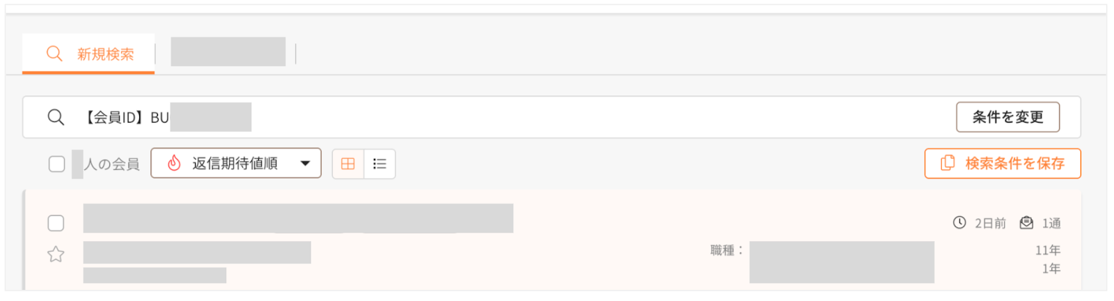 ※「新規検索」タブで検索している場合は、「検索条件を保存」ボタンから、検索条件を保存すると切り替えボタンが表示されます。 - プラチナスカウト(一時未ログイン専用)を送信したい会員のチェックボックスにチェックを入れて、「一括スカウト送信」ボタンを表示します。