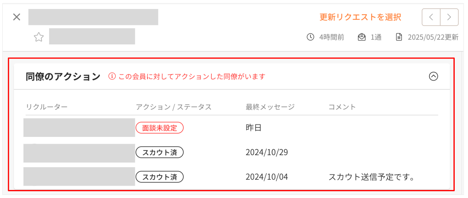 貴社の他のリクルーターがその会員に対して、プラチナスカウトを送信したり、求人応募やスカウト返信で接点がある場合は、職務経歴書画面に、「同僚のアクション」という欄が表示されます。