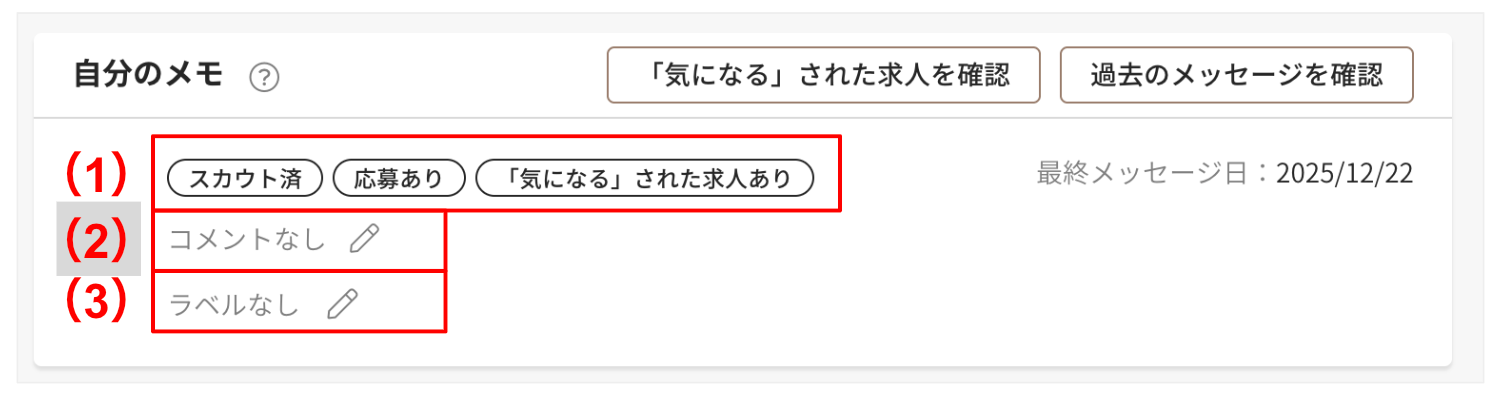 その会員へのリクルーターのアクション、コメント、ラベルなどを確認できます。