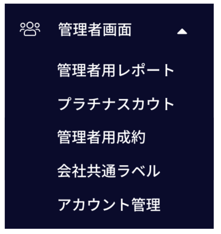 管理者画面とは、貴社の全アカウント分の実績やプラチナスカウト、アカウントなどの管理・操作が行える画面です。操作できる内容は以下の表にある5つです。
